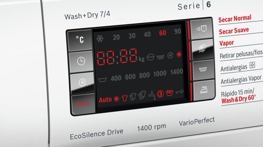 1400 RPM. 7-4 KG. BLANCO. "A". FUNCION SECADO. MOTOR ECOSILENCE. DISPLAY LED. PROGRAMA VAPOR. PAUSA+CARGA. VARIOPERFECT. ILUMINACION INTERIOR. TECNOLOGIA ACTIVEWATER. SENSOR DESEQUILIBRIOS 3G. SENSOR SOBREDOSIFICACION.
