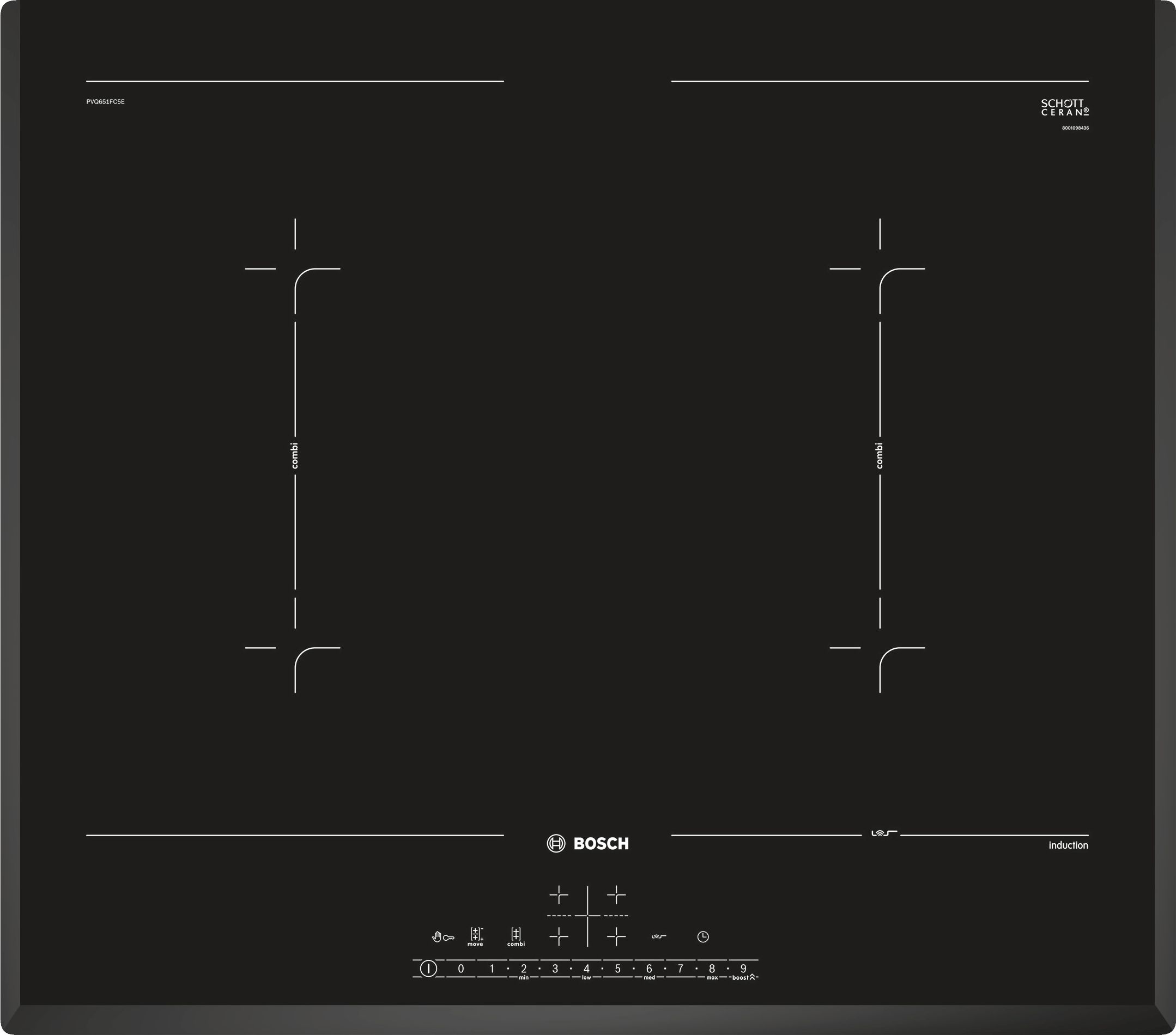 BOSCH, PVQ651FC5E, Encimera, Inducción, Encastrable, 60 cm, 4 zonas, Color negro / biselada, DirectSelect, función combi 2 + 2 zonas, control de temperatura en zona delantera dcha. (19 x 21 cm.)