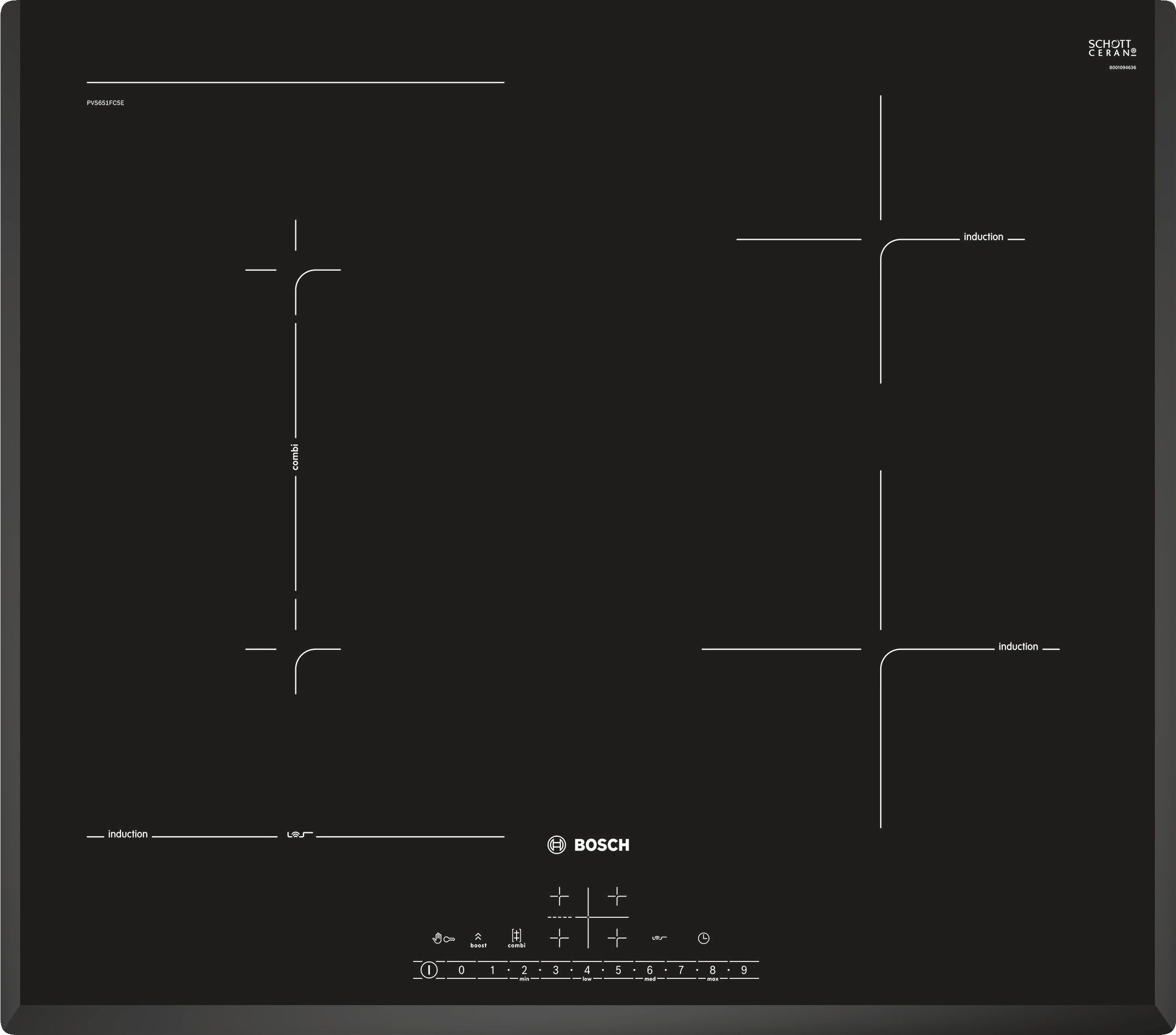 BOSCH, PVS651FC5E, Encimera, Inducción, Encastrable, 60 cm, 4 zonas, Color negro / biselada, DirectSelect, función combi 2 zonas, control de temperatura en zona delantera izq. (19 x 21 cm.)