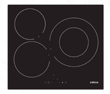 3 INDUC (ZONA DOBLE 28 CM). BORDE REDONDEADO. TOUCH. SELECTOR DE POTENCIA CENTRALIZADO, CON 9 POTENCIAS Y CELERIS. SELECTOR DE TEMPORIZADOR. BLOQUEO DE SEGURIDAD. INDICADOR DE CALOR RESIDUAL.