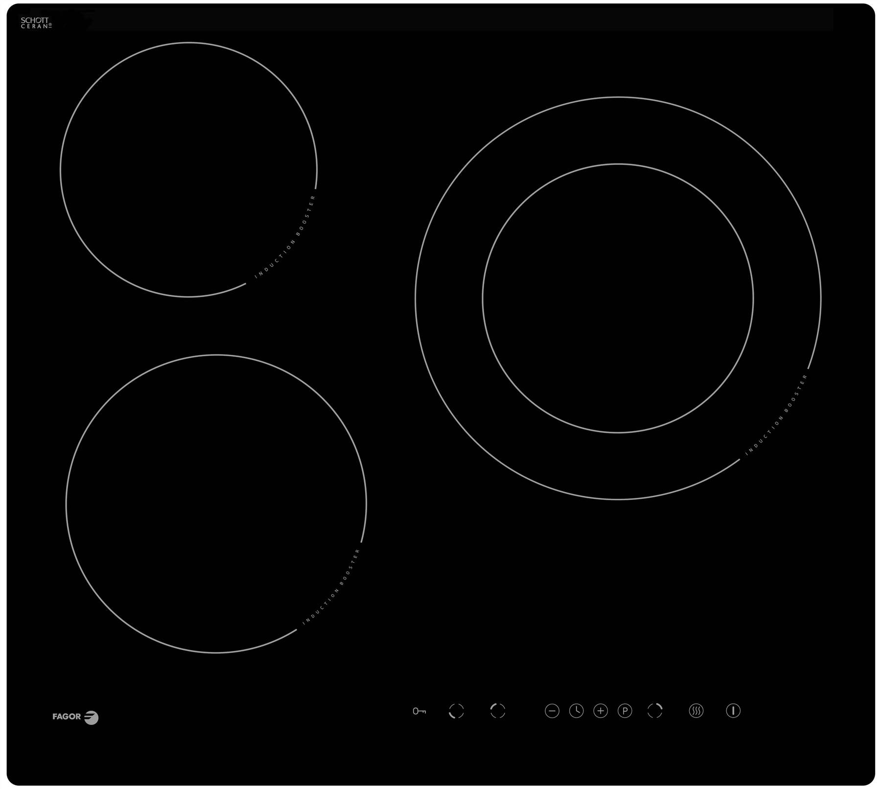 3 INDUC (ZONA DE 28 CM). CORTE RECTO. CONTROL ELECTRONICO. 3 BOOSTER. 1 FUNCION DE COCINADO Y EBULLICION AUTOMATICA.